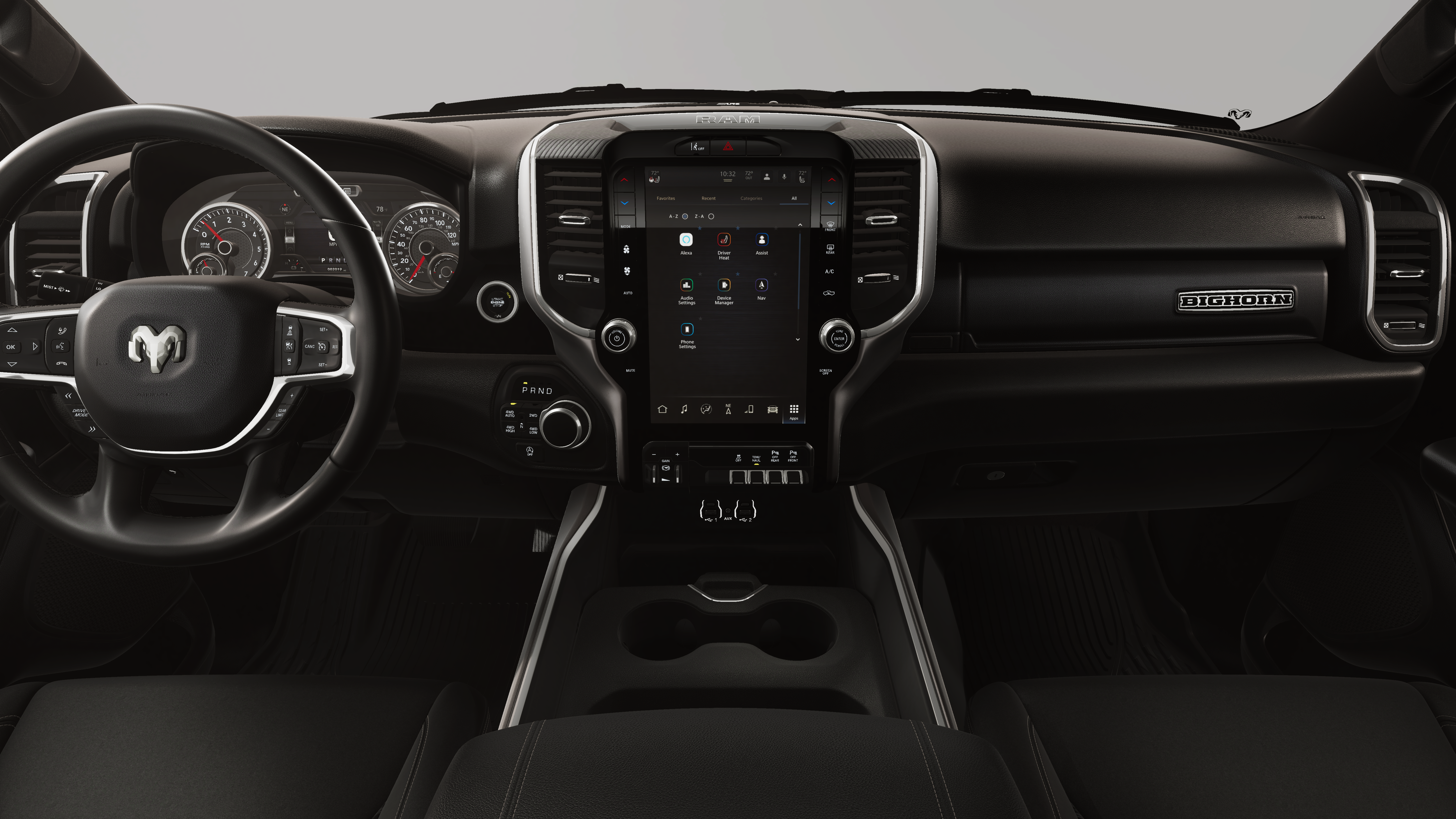 Quick Order Package 27Z Big Horn. Big Horn Level 2 Equipment Group: Google Android Auto; SiriusXM Radio Service; USB Host Flip; Power Adjustable Pedals; Leather Wrapped Steering Wheel; Integrated Voice Command with Bluetooth®; 12" Touchscreen Display; Glove Box Lamp; Auto Power-Folding Mirrors; 115V Auxiliary Rear Power Outlet; Media Hub with 2 Charge Only USBs; Heated Front Seats; Security Alarm; Black Premium Power Mirrors; Apple CarPlay; Premium Overhead Console; 9 Amplified Speakers with Subwoofer; Disassociated Touchscreen Display; Body Color Fender Flares; Remote Tailgate Release; 115V Auxiliary Power Outlet; LED Dome Lamp with On/off Switch; Universal Garage Door Opener; 2nd Row in Floor Storage Bins; Sun Visors with Illuminated Vanity Mirrors; LED Footwell Lighting; Rear Window Defroster; Integrated Center Stack Radio; Rear View Auto Dim Mirror; Rear Power Sliding Window; Connectivity - US/Canada; GPS Navigation; 4G LTE Wi-Fi Hot Spot; GPS Antenna Input; Overhead LED Lamps; Exterior Mirrors with Heating Element; Auto Dim Exterior Driver Mirror; SiriusXM with 360L; Global Telematics Box Module; Connected Travel and Traffic Services; Heated Steering Wheel; Configurable Drive Mode; 400W Inverter; HD Radio; Deluxe Cloth Bucket Seats; Uconnect 5 Navigation with 12.0" Display Radio; Exterior Mirrors with Supplemental Signals; Steering Wheel Mounted Audio Controls; Exterior Mirrors Courtesy Lamps; Air Conditioning ATC with Dual Zone Control; Cluster 7.0" TFT Color Display; Convex Wide-Angle Exterior Mirror Insert. Night Edition: 275/55R20 OWL All Season Tires; Accent Color Premium Power Mirrors; Exterior Mirrors with Supplemental Signals; Black Headlamp Bezels; Exterior Mirrors Courtesy Lamps; Grille Black Surround Black Mesh; Auto Power-Folding Mirrors; Exterior Mirrors with Heating Element; 20" X 9.0" Aluminum Painted Clad Wheels; Auto Dim Exterior Driver Mirror; Black Exterior Truck Badging; Anti-Spin Differential Rear Axle; Accent Color Door Handles; Accent Color Tailgate Handle; Black Interior Accents; Dual Exhaust with Black Tips; Body Color Front Bumper; Convex Wide-Angle Exterior Mirror Insert; Body Color Rear Bumper with Step Pads; Black Tail Lamp Bezels; RAM Grille Badge - Black; Black Painted Exterior Mirrors Caps. Protection Group: Steering Gear Skid Plate; Tow Hooks; Transfer Case Skid Plate; Fuel Tank Skid Plate. Quick Order Package 23Z Big Horn. 9 Amplified Speakers with Subwoofer. Anti-Spin Differential Rear Axle. Trailer Brake Control. Forged Blue Metallic. MOPAR Front and Rear Rubber Floor Mats. 3.92 Rear Axle Ratio. Rear Wheelhouse Liners. **Equipment listed is based on original vehicle build and subject to change. Please confirm the accuracy of the included equipment by calling the dealer prior to purchase.**