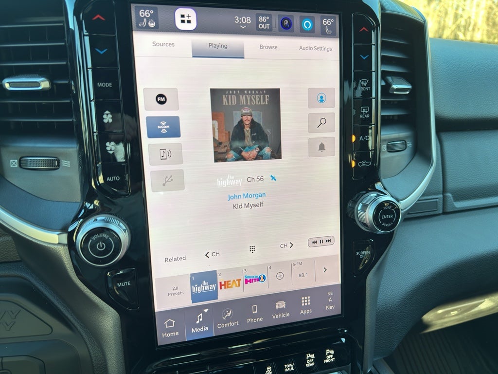 Quick Order Package 2UZ Big Horn. Night Edition: Firestone Brand Tires; Gloss Black Nostrils/mic Black Grille; LT285/60R20E OWL On/off Road Tires; Black Exterior Truck Badging; 20" X 8.0" Black Painted Aluminum Wheels; Body Color Grille-Surround; Black Interior Accents; Black Wheel Center Hub; Painted Front Bumper; Painted Rear Bumper. Big Horn Level 1 Plus Equipment Group: Google Android Auto; SiriusXM Radio Service; For Details. Visit DriveUconnect.com; For More Info. Call 800-643-2112; Integrated Voice Command with Bluetooth®; Emergency Vehicle Alert System (EVAS); 12" Touchscreen Display; Glove Box Lamp; Auto Power-Folding Mirrors; Footwell Courtesy Lamp; Anti-Spin Differential Rear Axle; Mirror Running Lights; MOPAR Deployable Bed Step; Alexa Built-In; Apple CarPlay; Power-Adjustable Convex Aux Mirrors; Forward and Reverse Utility Lights; Locking Lower Glove Box; Remote Start System; 9 Alpine Speakers with Subwoofer; Disassociated Touchscreen Display; Dual Glove Boxes; 2nd Row in Floor Storage Bins; Rear View Auto Dim Mirror; Rear Dome with On/off Switch Lamp; LED Bed Lighting; Connectivity - US/Canada; GPS Navigation; 4G LTE Wi-Fi Hot Spot; GPS Antenna Input; Exterior Mirrors with Heating Element; SiriusXM with 360L; Global Telematics Box Module; Connected Travel and Traffic Services; Foam Bottle Insert (door Trim Panel); Black Exterior Mirrors; Big Horn Instrument Panel Badge; Off-Road Info Pages; Selectable Tire Fill Alert; Trailer Tow Pages; HD Radio; Uconnect 5 Navigation with 12.0" Display Radio; Power Heated Folding Telescopic Mirrors; Exterior Mirrors with Supplemental Signals; Steering Wheel Mounted Audio Controls; Exterior Mirrors Courtesy Lamps; Air Conditioning ATC with Dual Zone Control; MOPAR Spray in Bedliner; Power Adjust Mirrors; Luxury Steering Wheel; Power Telescoping Mirrors. Heated Seats and Wheel Group: Heated Front Seats; Heated Steering Wheel. Anti-Spin Differential Rear Axle. Premium Cloth Bucket Seats. Remote Start System. MOPAR Front and Rear Rubber Floor Mats. Power 2-Way Driver Lumbar Adjust. Clearance Lamps. Transfer Case Skid Plate Shield. **Equipment listed is based on original vehicle build and subject to change. Please confirm the accuracy of the included equipment by calling the dealer prior to purchase.**