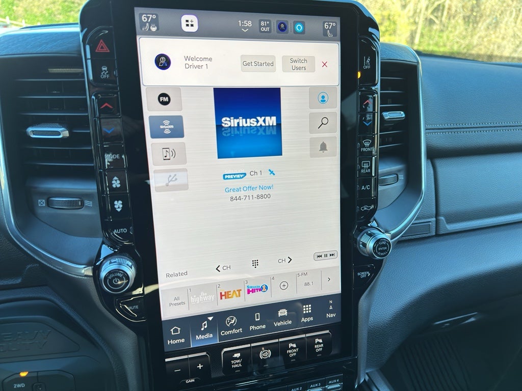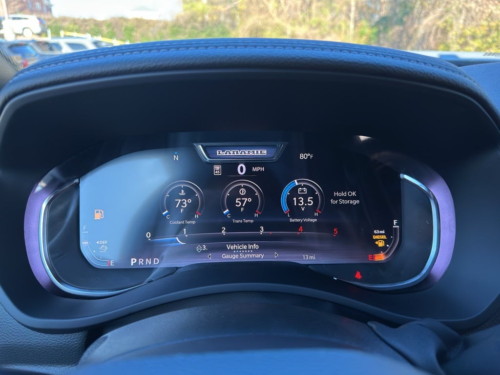 Quick Order Package 24H Laramie. Night Edition: Firestone Brand Tires; LT285/60R20E OWL On/off Road Tires; Black Exterior Truck Badging; 20" X 8.0" Black Painted Aluminum Wheels; Gloss Black Grille Billets/accents; Body Color Grille-Surround; Sport Performance Hood; Black Exterior Mirrors; Black Wheel Center Hub. Laramie Level 2 Plus Equipment Group: Google Android Auto; SiriusXM Radio Service; Power Adjustable Pedals with Memory; For Details. Visit DriveUconnect.com; For More Info. Call 800-643-2112; Integrated Voice Command with Bluetooth®; Emergency Vehicle Alert System (EVAS); Power Deployable Running Boards; Auto Power-Folding Mirrors; Anti-Spin Differential Rear Axle; Drowsy Driver Detection; Mirror Running Lights; MOPAR Deployable Bed Step; Alexa Built-In; Apple CarPlay; Power-Adjustable Convex Aux Mirrors; Active Lane Management System; Forward and Reverse Utility Lights; Disassociated Touchscreen Display; Remote Tailgate Release; 17 Speaker Harman/kardon Premium Sound; 2nd Row in Floor Storage Bins; Center Stop Lamp with Cargo View Camera; Rain Sensitive Windshield Wipers; LED Bed Lighting; Connectivity - US/Canada; Traffic Sign Recognition; GPS Navigation; 4G LTE Wi-Fi Hot Spot; Adaptive Steering System; GPS Antenna Input; Exterior Mirrors with Heating Element; Auto Dim Exterior Mirror; SiriusXM with 360L; Global Telematics Box Module; Connected Travel and Traffic Services; Foam Bottle Insert (door Trim Panel); Off-Road Info Pages; Selectable Tire Fill Alert; Trailer Tow Pages; Leather Trimmed Bucket Seats; HD Radio; 14.4" Touchscreen Display; Power Heated Fold Telescopic Mirrors with Memory; Exterior Mirrors with Supplemental Signals; Exterior Mirrors Courtesy Lamps; Uconnect 5 Nav with 14.4" Display; MOPAR Spray in Bedliner; Auto High Beam Headlamp Control; Chrome Exterior Mirrors; Exterior Mirrors with Memory; Power Adjust Mirrors; Power Telescoping Mirrors; Auto Dim Exterior Passenger Mirror; Auto Adjust in Reverse Exterior Mirrors. Power Sunroof. Power Deployable Running Boards. 5th Wheel/gooseneck Towing Prep Group. Leather Trimmed Bucket Seats. Center Stop Lamp with Cargo View Camera. Instrument Panel Mounted Auxiliary Switches. MOPAR Front and Rear Rubber Floor Mats. Clearance Lamps. Transfer Case Skid Plate Shield. **Equipment listed is based on original vehicle build and subject to change. Please confirm the accuracy of the included equipment by calling the dealer prior to purchase.**